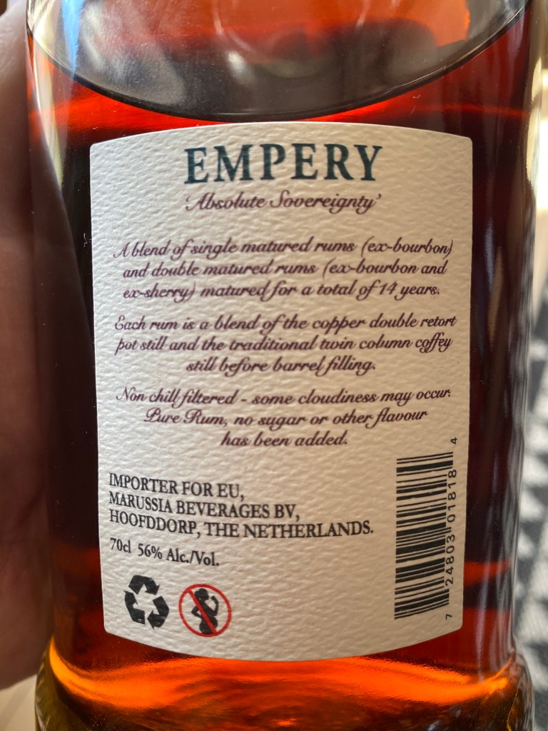 Cette cuvée Empery est composée d’un assemblage de rhums distillés en alambic et colonne, puis vieillis en fûts ex-Bourbon et ex-Sherry pendant 14 ans, et enfin embouteillés sans réduction ni filtration ni ajout d’aucune sorte.